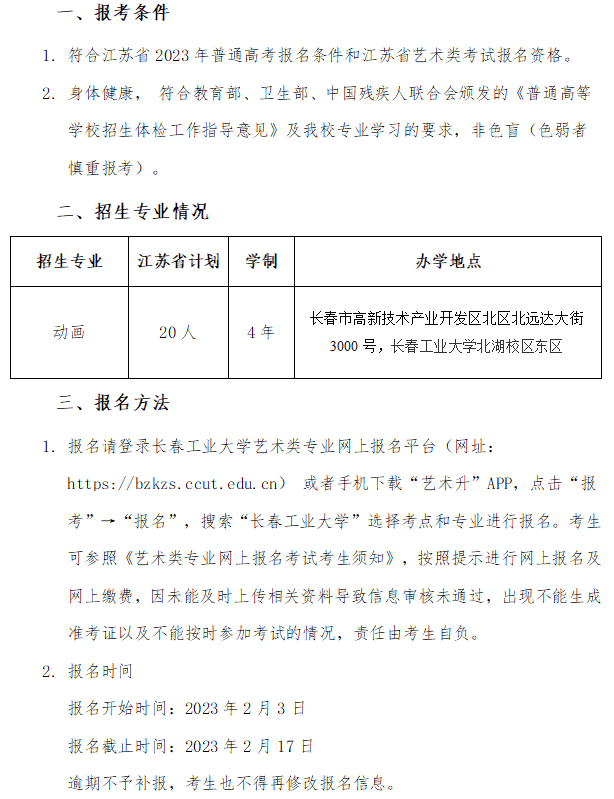长春工业大学2023年江苏省动画专业招生简章